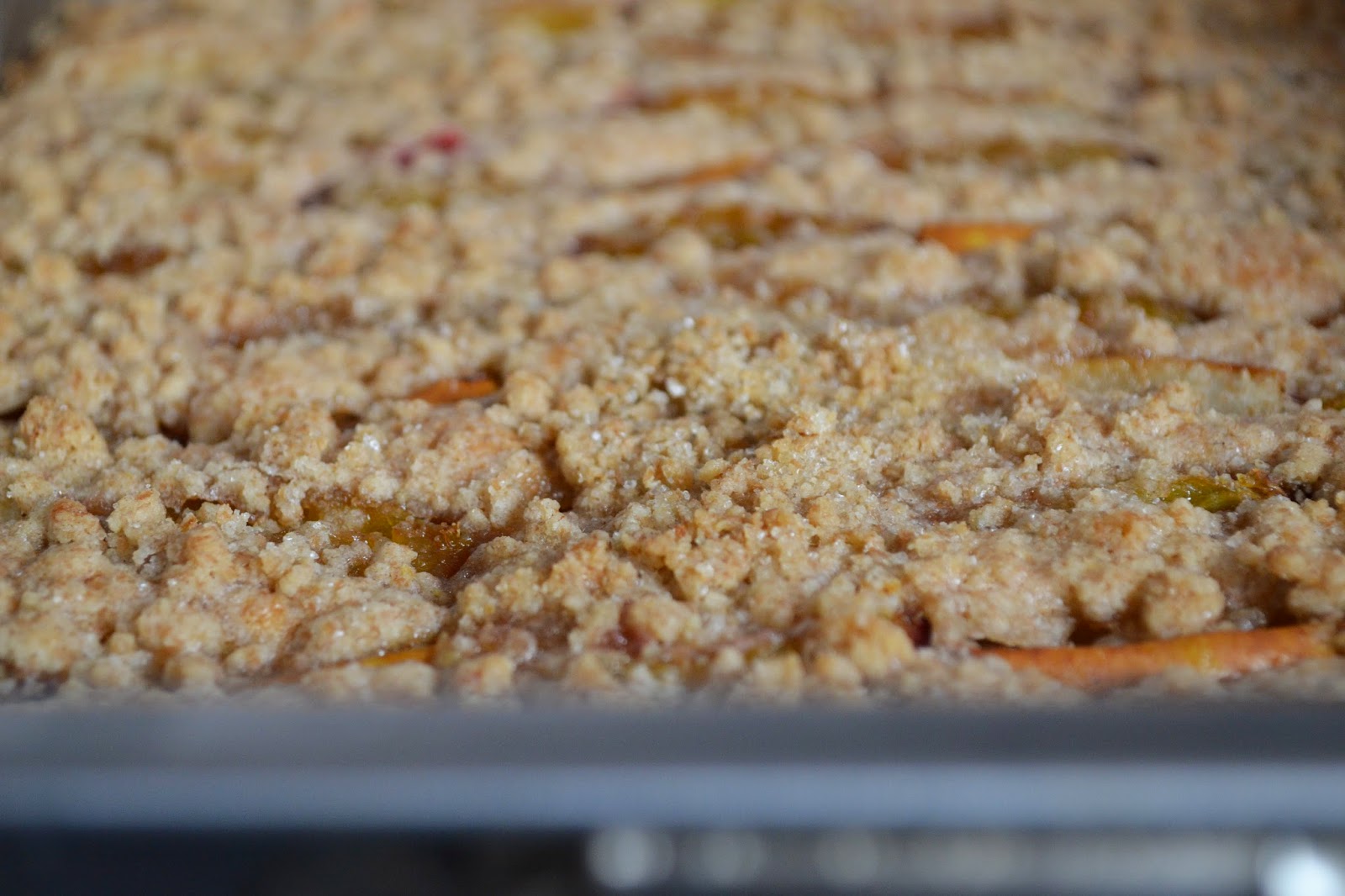 - Zwetschken-Birnen-Kuchen mit Streusel bestreuen und für 20-25 Minuten backen.